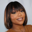 Put On and Go Reddish Purple / Brown Highlight / Natural Black Layered Cut Yaki Straight Minimalist Lace Bob Wig with Bangs - Brown Highlight (Breathable Cap) / 10 inches / 10 inches is backordered and will ship as soon as it is back in stock.