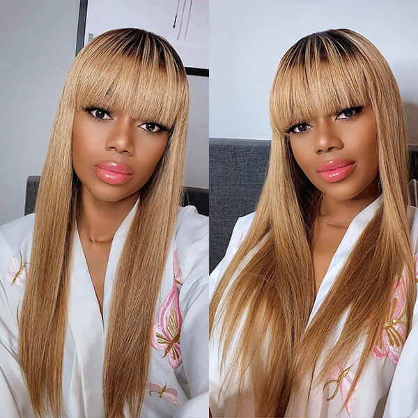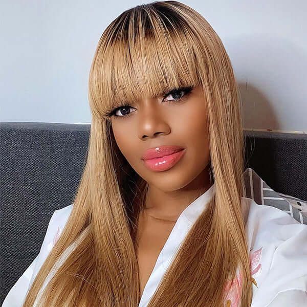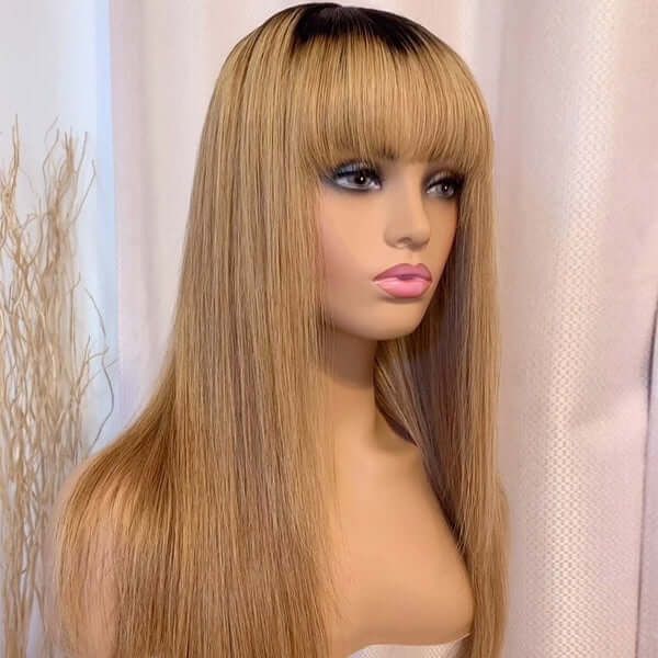 Honey Brown Ombre Bangs Human Hair Glueless 4x4 Lace Closure Wig
